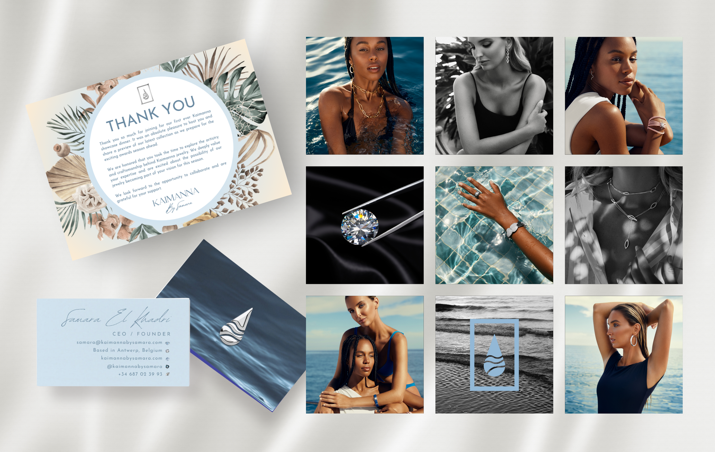 Kaimanna by Samara is a luxury jewelry brand inspired by the ocean, with its signature blue hues and nautical elements reflected in its logo. Muse curated a sophisticated, ocean-themed aesthetic for the brand’s social media presence, seamlessly blending their exquisite jewelry pieces with the fluidity of the sea. Additionally, we crafted a modern and sleek lookbook that beautifully highlights the elegance of Kaimanna's collections.
